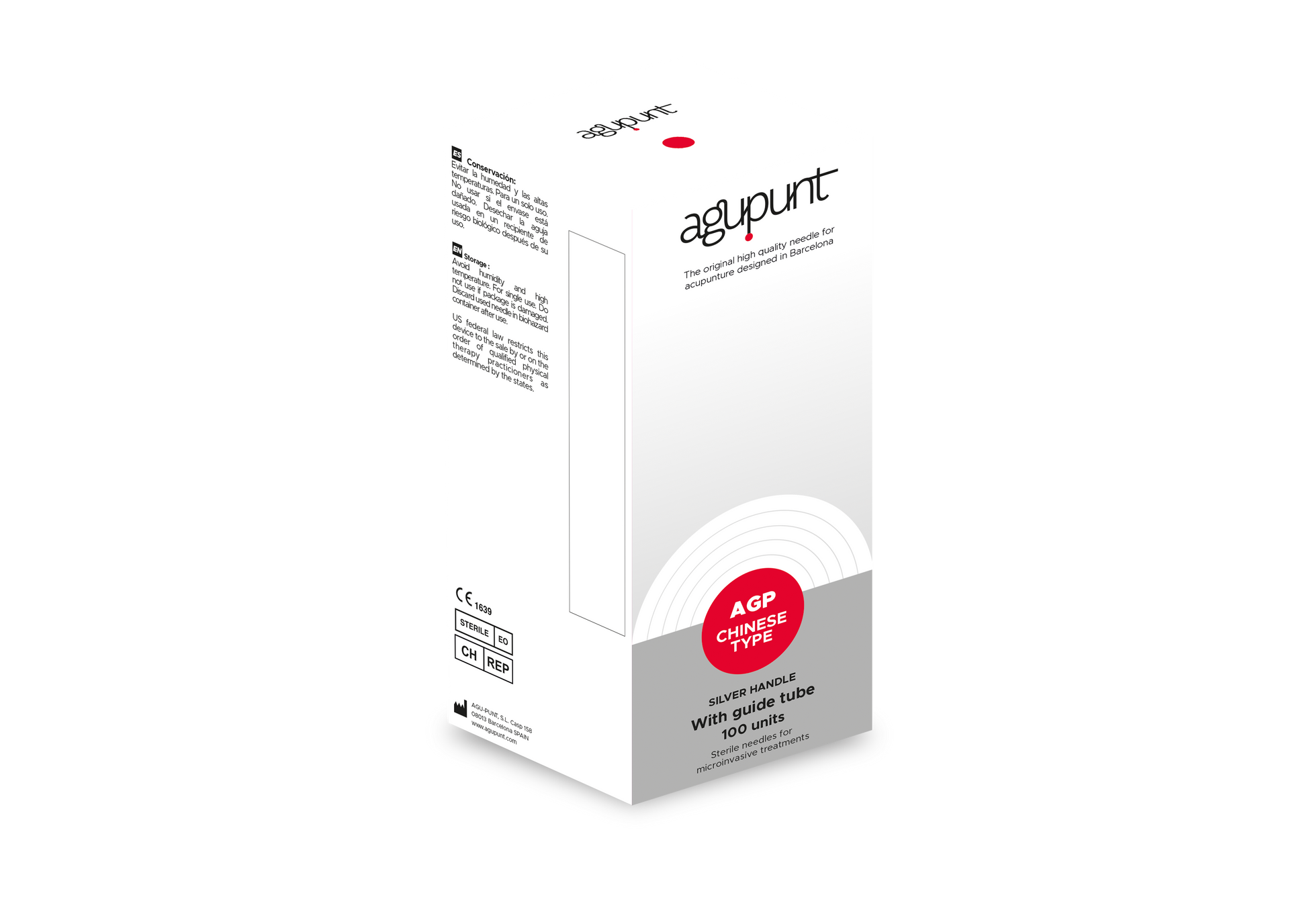 Chinese Agupunt Needles with a Silver Handle and Guide Tube, featuring two polishing processes and two layers of oil, ensuring an extremely precise and finer puncture. Box of 100 individually packaged needles.